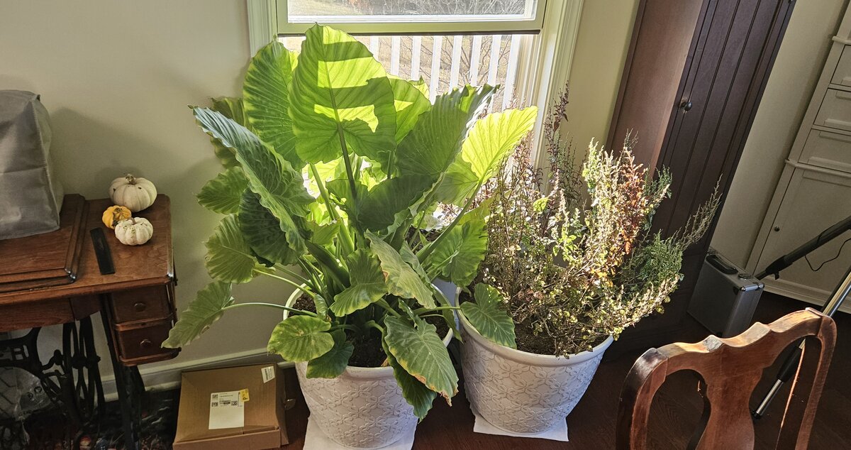Two types of black taro in my office. Tossed peacelily bits were discovered sprouting when reusing soil...potted. will try to sell it off once growing or add it to the teal pot in next pic.