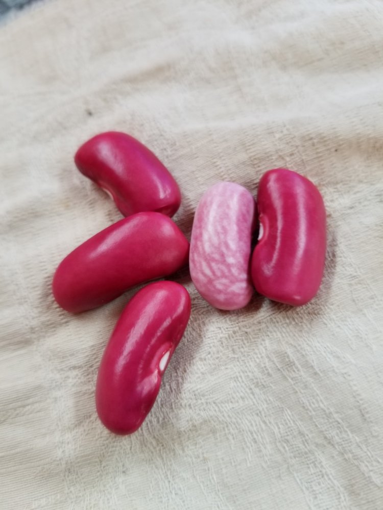 It doesn't happen that often, but in maybe 10% to 15% of the pods I open, I get beans that look like this. All the beans are solid red like they should be except I'll get some that have one light bean. It is always the one on the stem end of the pod. I don't think all these are coming from the same plant but maybe. Has anyone seen anything like this before? I guess it could be a reverse but always at the stem end of the pod?