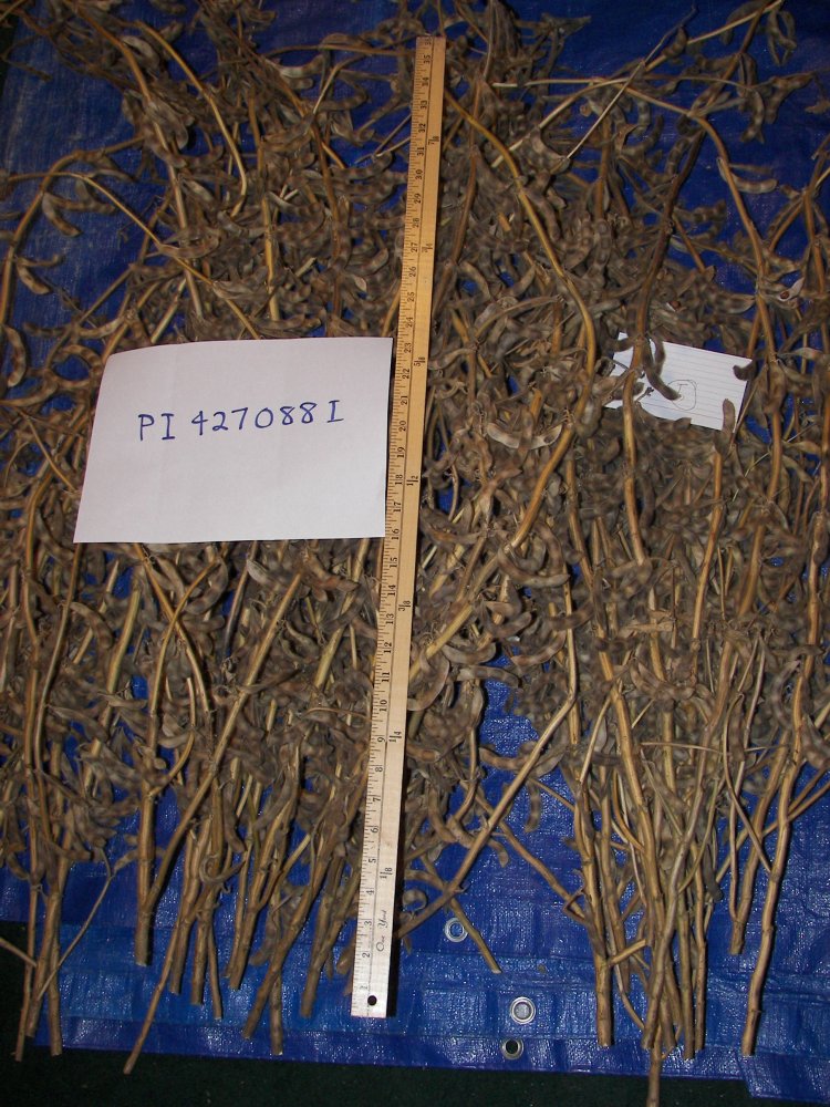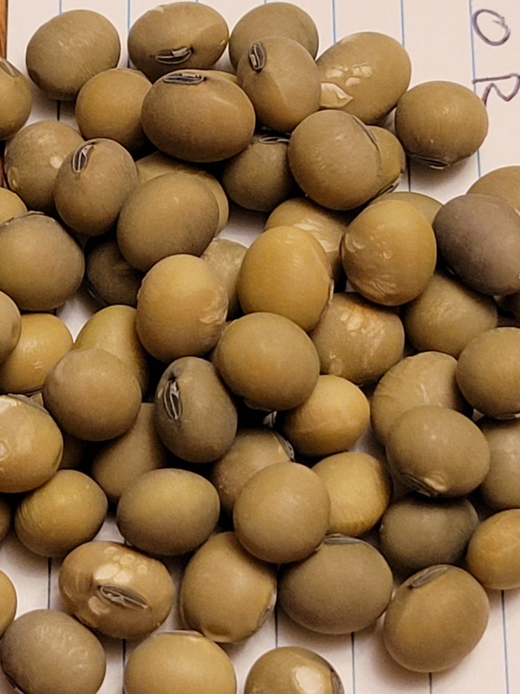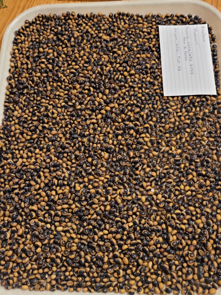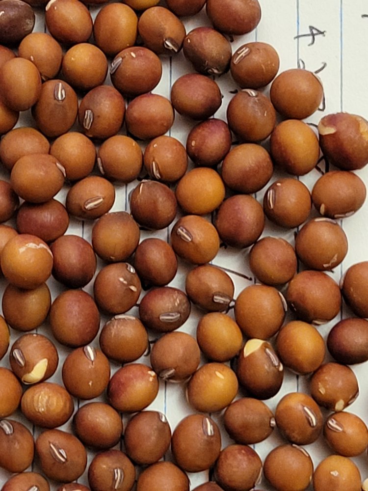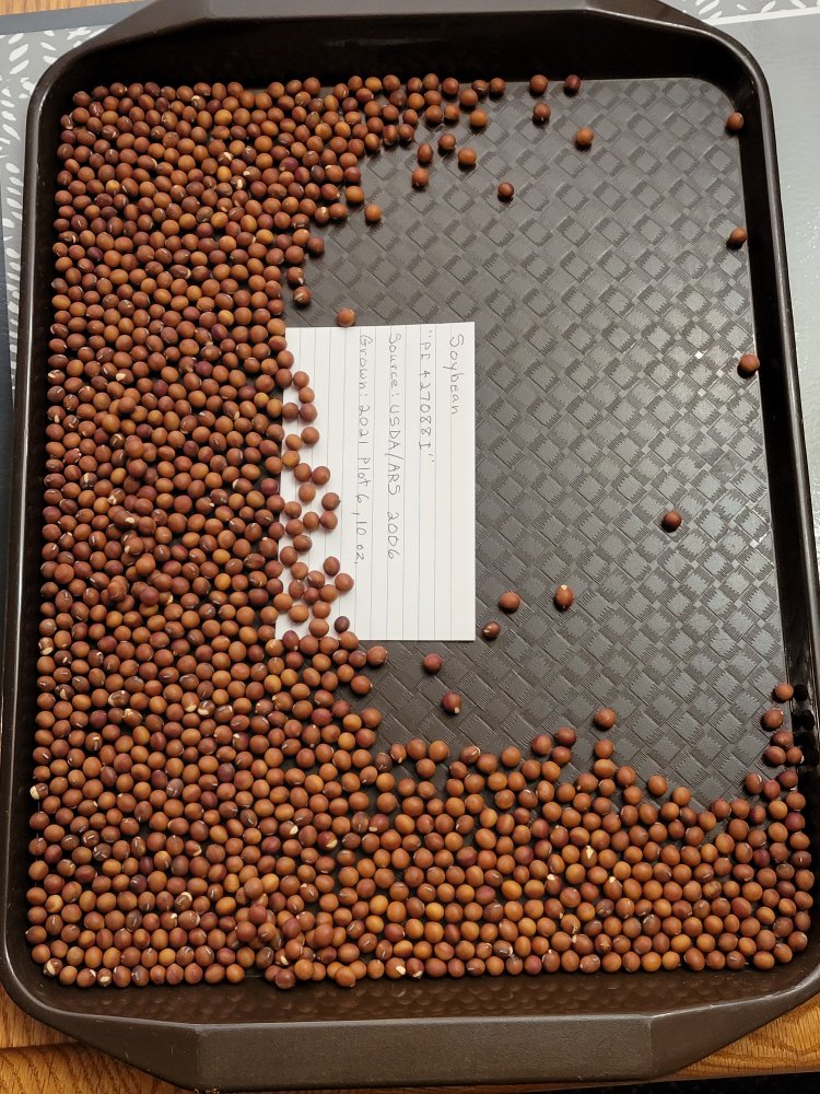 PI 427088 I, from the USDA/ARS 2006, originally from Jilin Sheng, China. Nearly spherical reddish-brown seeds. Tall, heavily-branched 33-36" plants benefit from support. This is a late variety that always pushes up against the frost, but has a very heavy yield. Nearly all pods are 3- or 4-seeded, and borne well off the ground. Another 2012 "rescue", started in pots due to failure in 2020. I was surprised that this was delicious harvested green as edamame, with fat seeds & the large number of seeds per pod offsetting the small seed size (150/ounce). I nearly dropped this variety from my collection (!!!) but it is outstanding as a late-season edamame, and I will be keeping it in rotation for that purpose. The biggest drawback of this variety (aside from the long DTM) is its vulnerability to moisture during ripening, and the high number of defective seed coats. I've had to cull the seeds heavily every time it was grown, but still ended up with 10 ounces of seed from an 8' row.