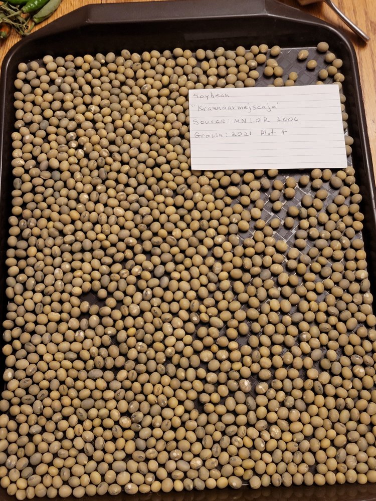 Krasnoarmejscaja, from the estate of the late Robert Lobitz in 2006, originally collected by the USDA in Russia. Main season, Maturity Group I. Short, very stout 12-16" plants, with long branches which bear over 50% of the pods. This is a large-seeded "gray" that I am investigating for use as soy nuts... its dry weight protein content can be over 47%. 2012 seed had zero germination in 2020, so it was started as transplants this year. Those transplants were so successful that I felt comfortable cutting one plant (above) for edamame, and harvested 16 ounces of seed.