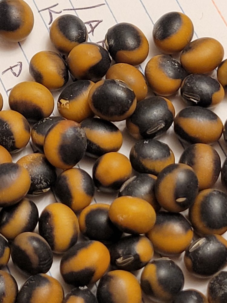 Musan-1, from the USDA/ARS 2006, originally from North Korea. Main season, Maturity Group I. Very tall 36-40" plants that required some support. 2012 seed failed in 2020, so it was started as 'rescue' transplants this year, and did very well. The USDA considers it to be only moderately productive; but in garden culture, it produced 2 pounds of seed from a 10' row. That is especially significant given its extraordinarily high protein content - 53% dry weight. The eye-catching seed coloration very closely resembles An,dunscaja, so the two were grown in different sites.