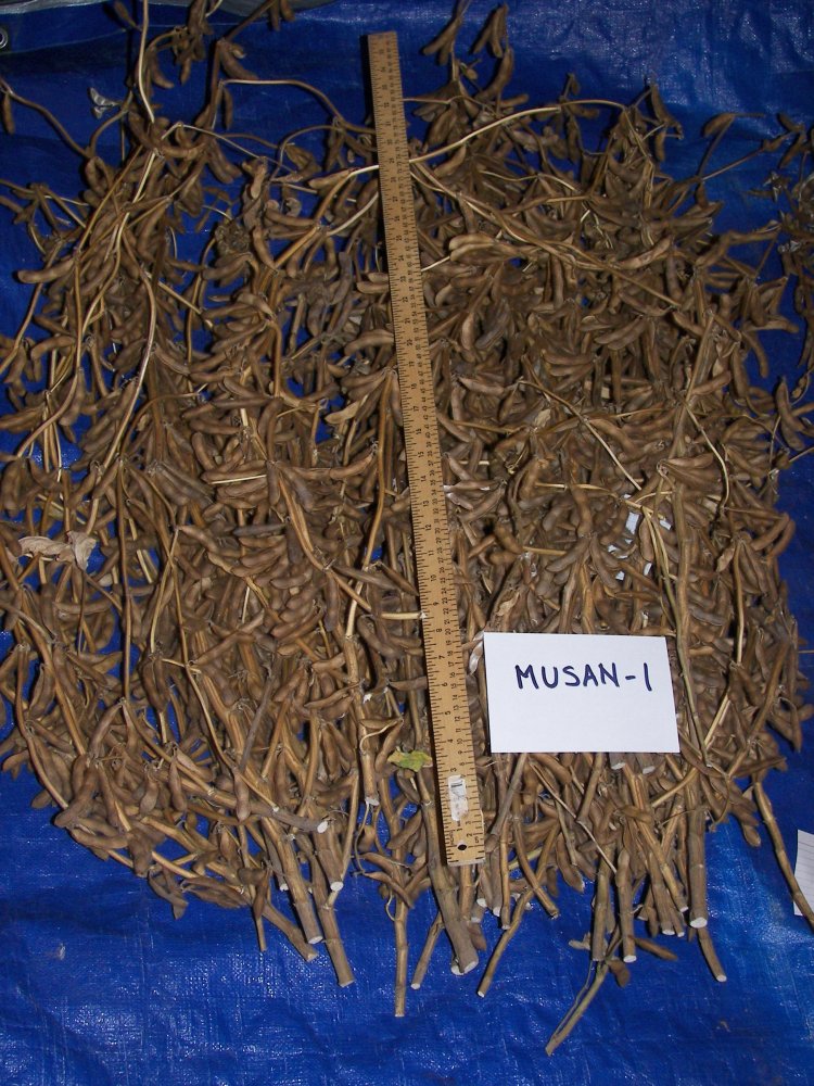 T239, from the estate of Robert Lobitz 2006, found as a mutation in Harosoy. VERY tall heavily-branched plants (40-44") that need some support. A very late variety (Maturity Group II) which at 115-120 days is normally a tight fit for my growing season - but fully matured this year. Yellow seeds with an unusual tan saddle, and a very high yield. While the USDA has no nutritional data for T239, presumably it has the same high 21%+ oil content as Harosoy. There were heavy attacks by Japanese beetles (which were really attracted to this one) and the plants basically overwhelmed both beetles & rodents to produce 24 ounces of seed from a 10' row.