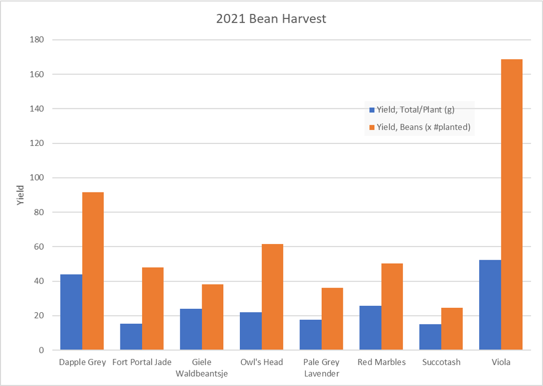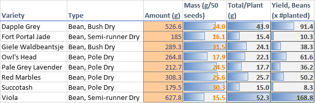 My personal selection, Succotash, was the lowest producing of the group but I did really love growing it and will do so again. As a consolation, it did generate the second highest bean mass after Giele Waldbeantsje.