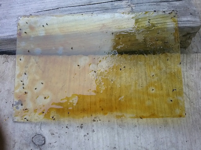 Here is a wee bit of gruesomeness, so beware, but last year I had these pesky little black bugs appear on the plants on one bean trellis. The jumping bugs were poking tiny holes into the leaves; I've never seen this before, ever. I tried neem, and diatomecous powder, but nothing seemed to work. Then I heard a BBC gardener give a talk about flea beetles and holding a molasses smeared piece of cardboard over the plants as you jiggle them,and the beetles jump off onto your cardboard and get stuck. Well, I tried it (on plastic,not cardboard) and it works. Captured about 80% of them int the first swipe. Then more a half hour later.