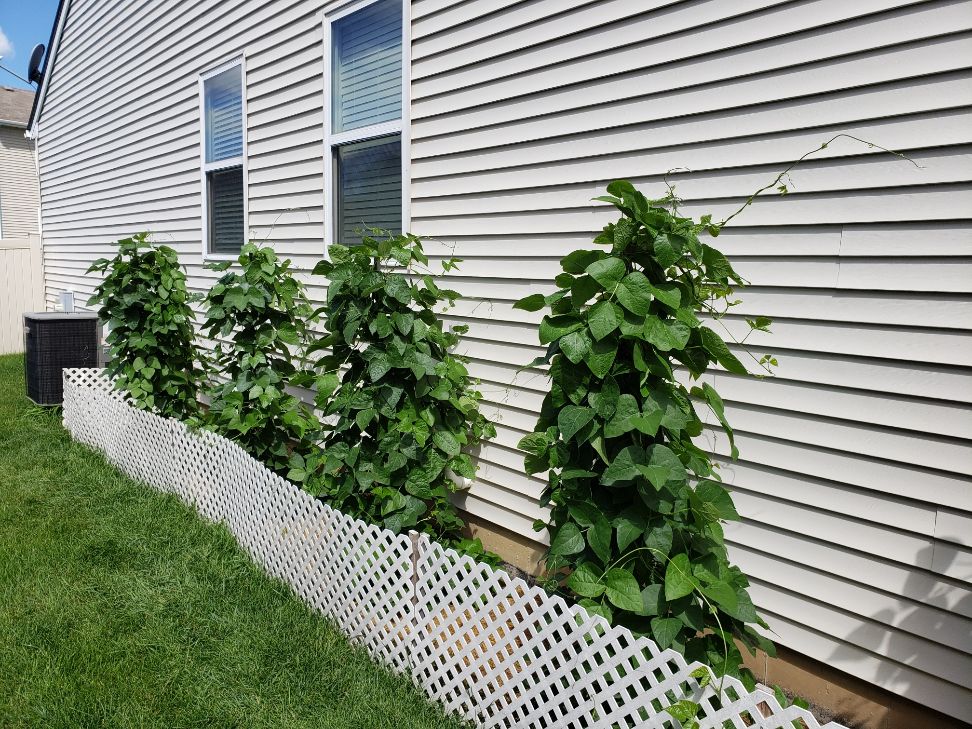 Spent some time, as in hours, in the pole bean patch today checking for any signs of mould and trimming where necessary. The 3 days of rain we got not long ago caused a wee bit here and there. So I trimmed leaves near the bottom of some plants to ensure good air flow, get some sunlight in and removed spent leaves from the ground. I don't want to take ANY chances if high humidity returns. The growth has been SO vigorous this year with most of the vines, the layers of foliage can cause problems. I saw a few leaves with joints damaged by mould. Thank goodness it's been hot and dry since that wet spell; I can definitely tell that beans are much more able to deal with drought than high moisture and humidity!