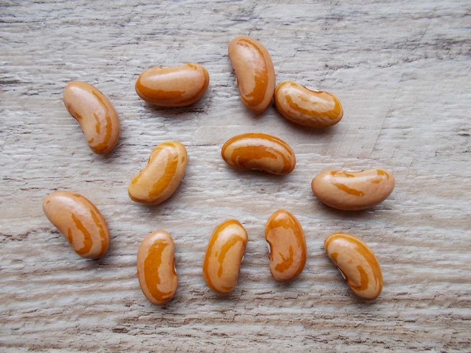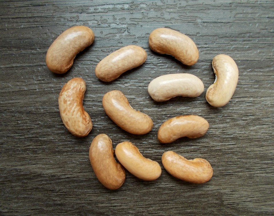 This bean is cool too. Large, elongated, strongly kidney-shaped seeds. The color is probably light beige.