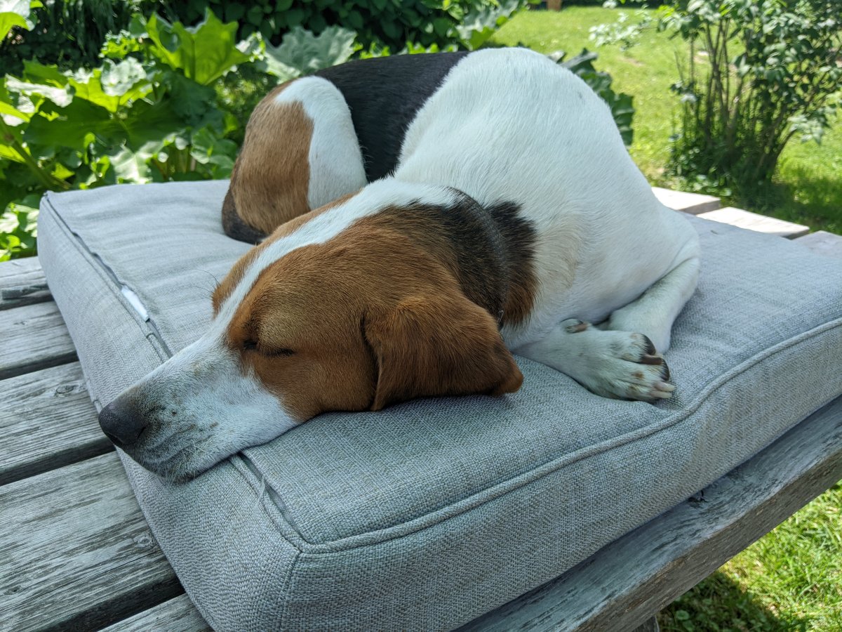 He's in a fenced in yard! We spent a lot of time beagleproofing it. He does run hard, especially on walks with a long lead, but he loooves a good sunny spot. His salvation all winter was the sun coming through our south facing windows, and he would sleep in those spots all morning, moving every half hour or so to keep up with them. When it's really hot out he'll move into the sun for a while, then head for shade to cool off, but he always goes back to the sun. We gave him this old chair pad as a bed on that table and he thinks he's in heaven.