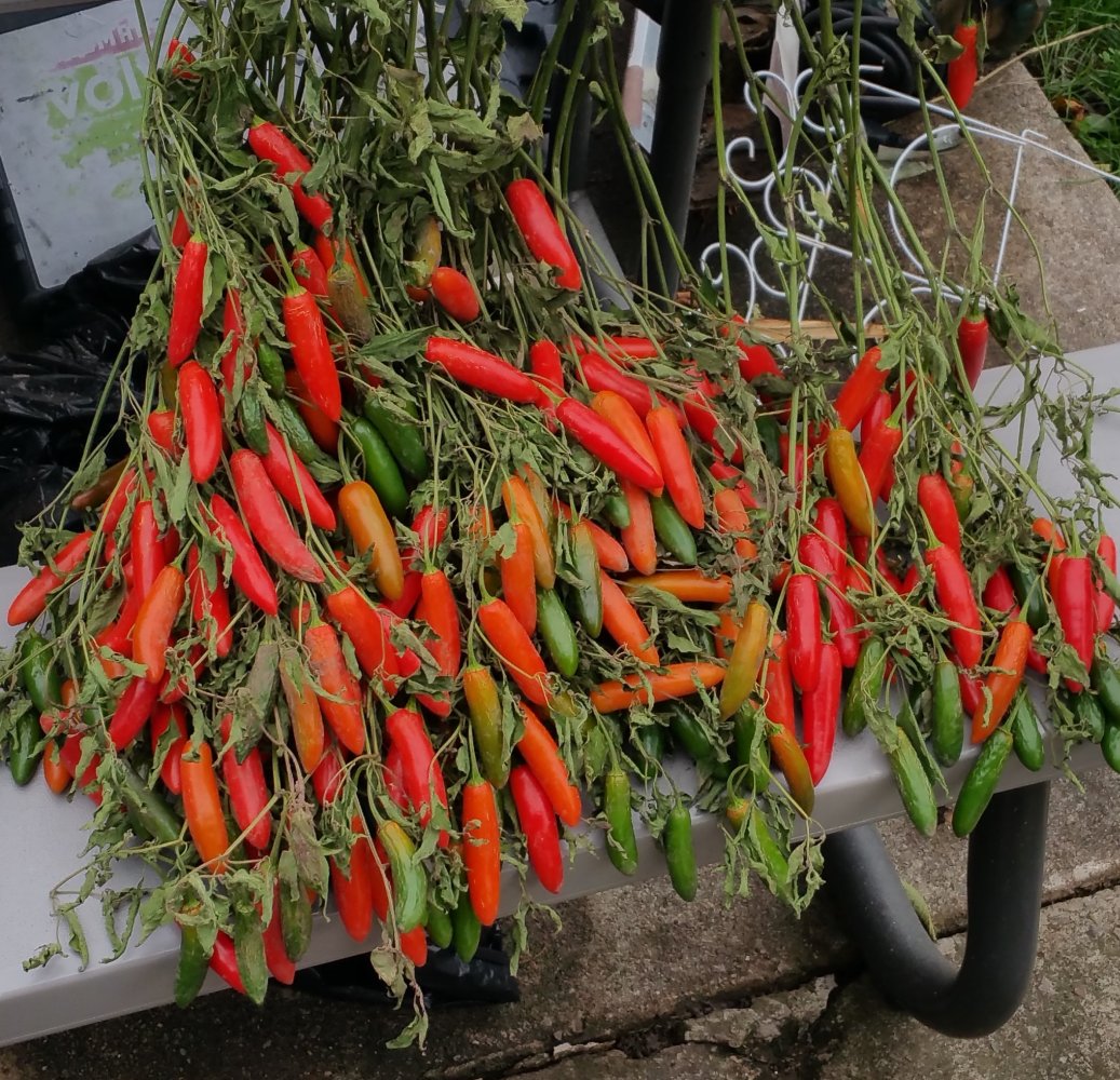 Based upon observations of the one I grow, Serranos can have a very large yield - but a late DTM. I get enough ripe peppers to save seed, but always have a lot of peppers still hanging when the frost arrives. At that point I cut the plants, and hang them in the garage for the peppers to ripen. These are from 2018: