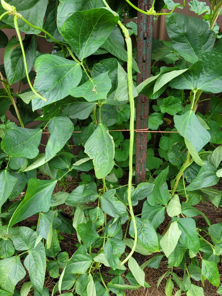 Yardlong "3-feet-plus". Later, just beginning to get pods now, but will bear heavily just before Fall (when snap beans have mostly quit). One of my longest yardlongs. Ironically, it always seems to end up in the same location (next to the pole building) but does well regardless.