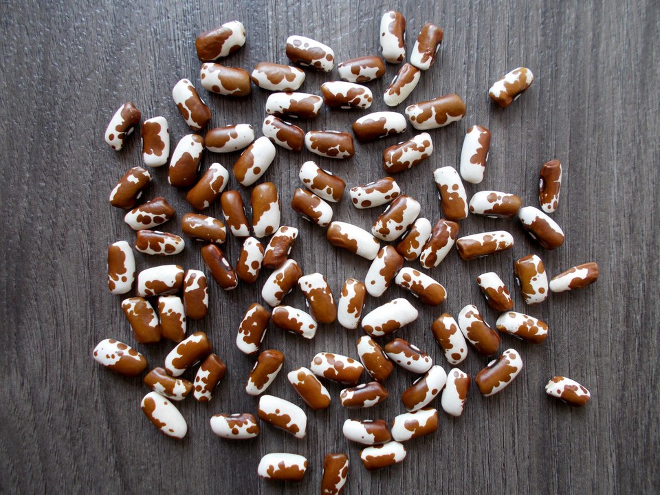 Peau de Vache Normande. Bean found by Jean-Luc Gatard from Réaumur, France. It's not stable yet. I got the seeds from Guy Dirix from Belgium. He grew the beans as a tall bush, but all my plants started climbing to a height of about 2 meters. The color of the seeds remained unchanged. Some of the seeds looked normal...