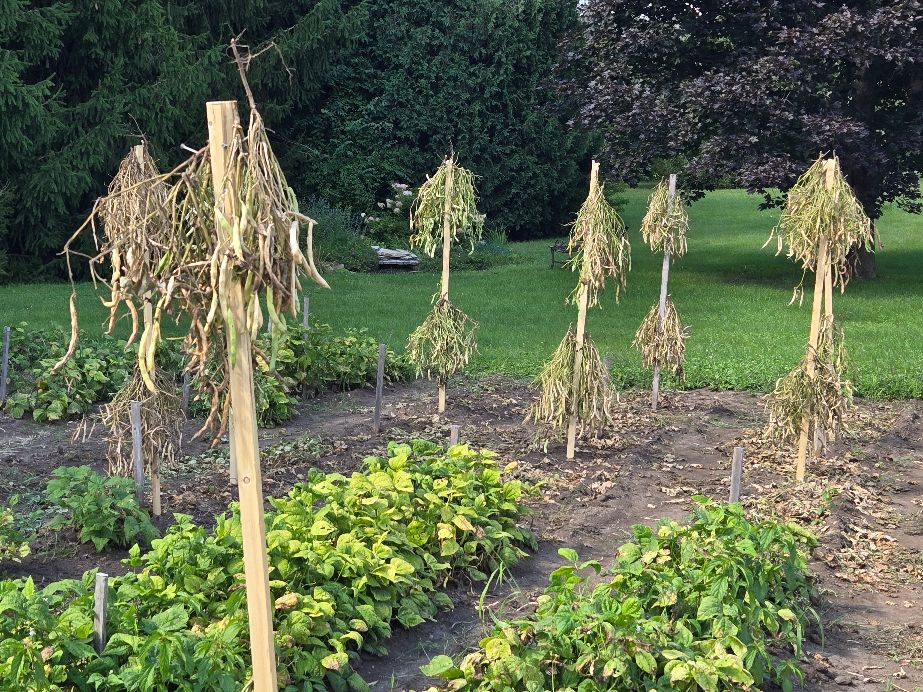 Have I shown this photo below before. This is what my bean plot looks like these days. This is just a small section. There are poles with bush plants hanging scattered through out my bush bean plot these days. Two weeks ago we had 4 inches, 10 cm of rain in 3 days. I started pulling out of the ground some of the most mature beans. I have some beans that mature later so they are still in the ground because I could see the seed development still wasn't there. I also like to clip off all the leaves so I get sun and air penetration to the max.