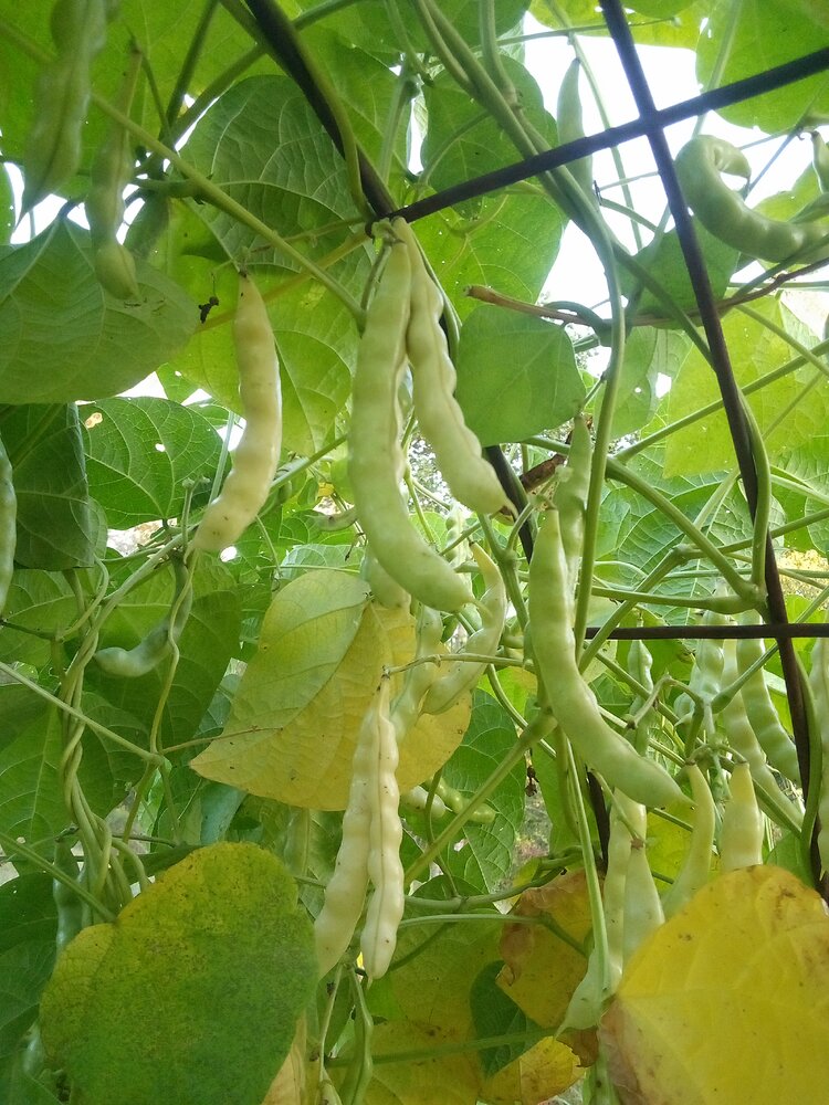 I don't think Doty India #1 is going to make it to mature seed. Pods are barely started, and seeds were planted quite early for my location. Just too late for my garden. The large pods at the lower left corner are a neighboring bean variety.