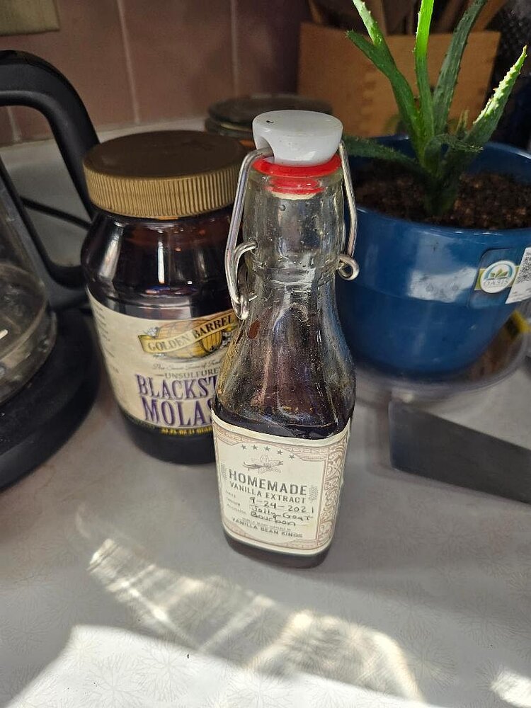 Here are some pictures of cookies in the process. Middle DD gave all of us home made vanilla in 2021 and I've hardly touched it. It's in bourbon and you need to shake it up before measuring out. I also had blackstrap molasses. I KNOW that recipes tell you to measure wet and dry ingredients separately, but when the dry ingredients are heavy they can be hard to get fully mixed, so I mixed in the salt, baking powder, ginger, nutmeg and cinnamon into the melted butter/egg mix first. I found 2 boxes of raisins to add to this. Soon, I will be baking...