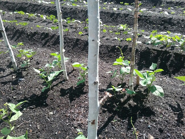 For the pole beans, you can't see it real good here as time works away at it, but I take my hand and run a circle around the beans around each pole so there is a watering indentation.