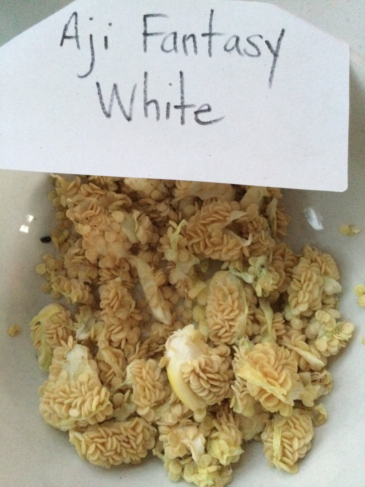 Harvested some pepper seeds. Unfortunately I harvested the Aji Fantasies a bit early, several of the pods had far too immature seeds. Luckily, I think there is still enough viable seed in the rest of the peppers. I guess white peppers are tricky to estimate for ripeness. I thought this pepper was top rate.
