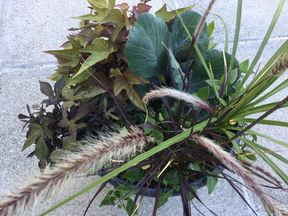In mid-July my local mom & pop grocery store put out a couple tables and offered up all their remaining greenhouse plants for free. Most of them were dead and beyond hope, but they were free, so I said what the heck they might be good for a fall planter. I brought them home and then proceeded to also neglect them in the tray, so neglect compiled on more neglect. 😜 Eventually I did get to them in their advanced stage of expiration, quickly slapped them all in a pot, added some food and water and went on with other things. And not much happened really. But last week I took a second look at the pot, and wow, stuff has come to life! Even the little Black Eyed Susan vine in there which I chopped right down might have a few teeny flowers by October! 🎃
