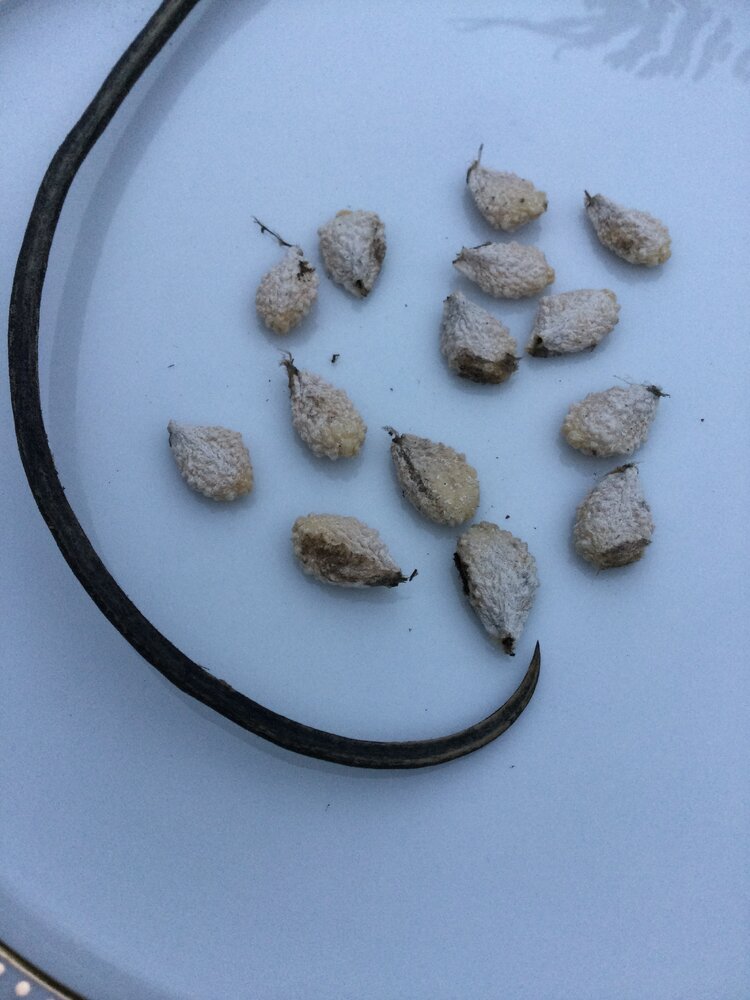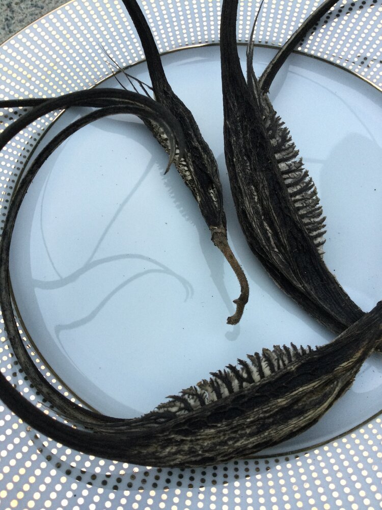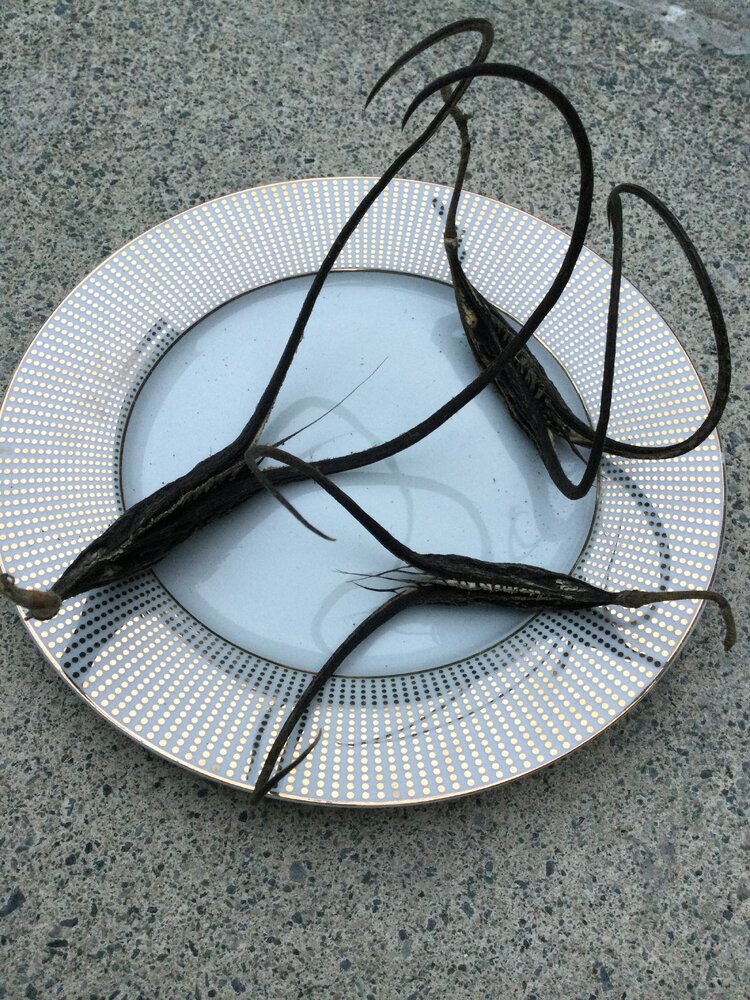 The most interesting seed pod I'm yet to see that isn't a bean - Devil's Claw. My vines were an utter fail, I think the plants have delicious roots and the voles spent the summer eating them. By August the vines remained alive but permanently wilted even when well watered. When I yanked them up there was almost no roots attached to the stems. Still, they made a few pods. I may try these again, I'm not sure. They are certainly fascinating. It is shockingly difficult to break open the seed halves. And the inside compartments where the seeds are hidden have what seems like a hard polymer surface. It's beyond rock hard, almost as though it's synthetic.