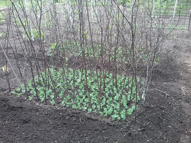 Both beds; they'll grow up into the sticks as a solid mass and very sturdy. The multiple holdings the tendrils have on the various branches really works well to stabilize the whole planting. This of course wouldn't be practical in a huge area, but it really works well for me since I don't have much space and I want to both eat the peas as well save lots of their seeds. I need to maximize production, and after all the many supports I've tried this is the best one for that. I find pea production is very much related to how well supported the peas think their kids will be, and if they see only a mediocre future that's how they produce.