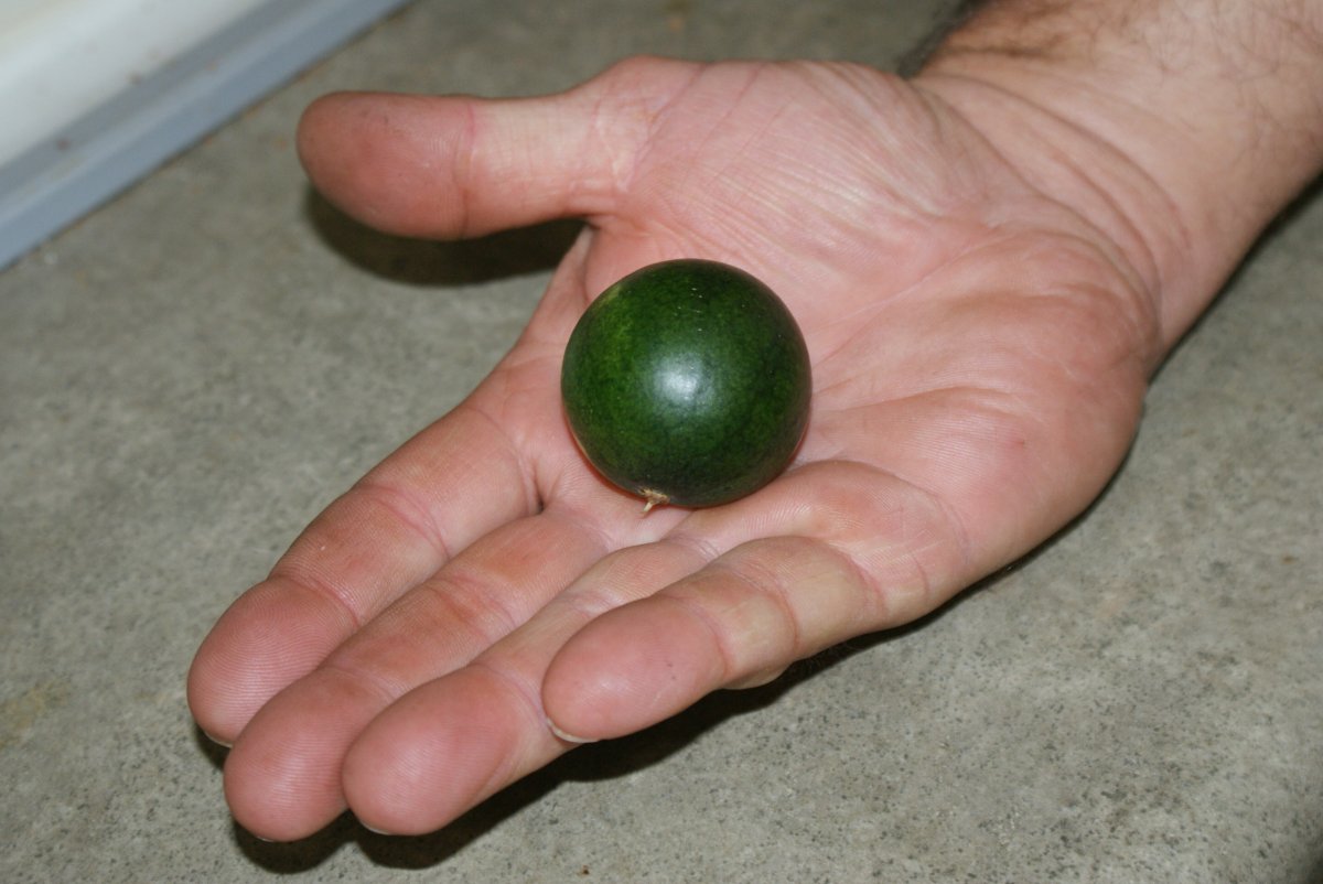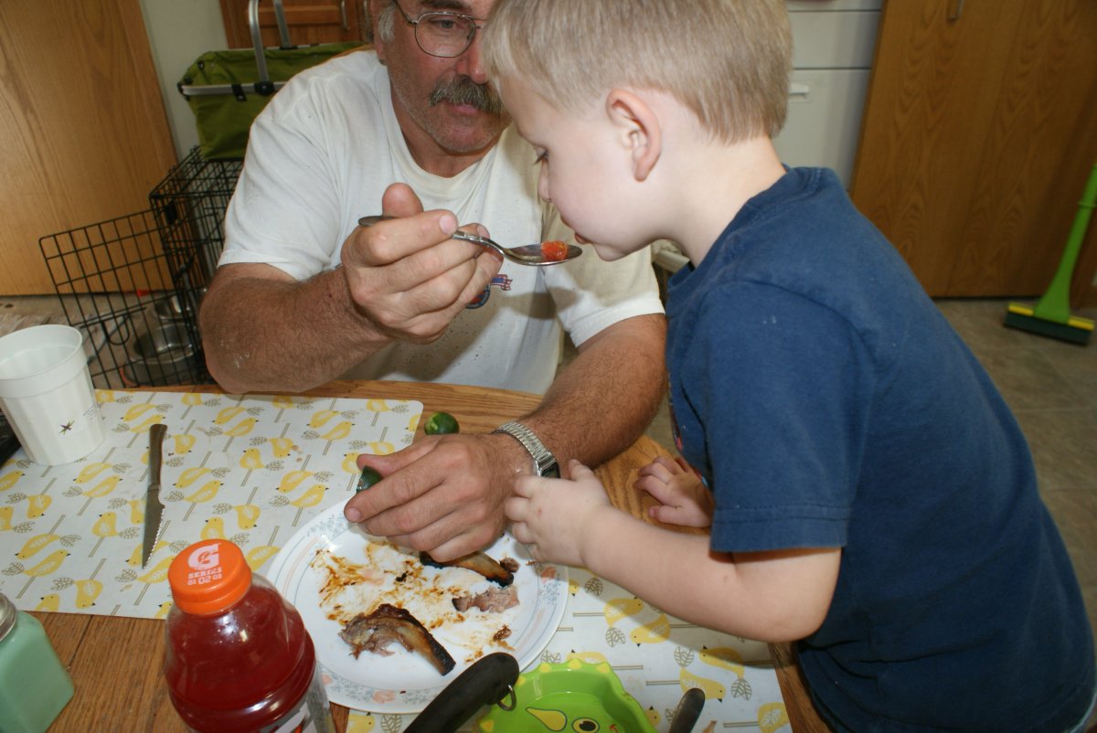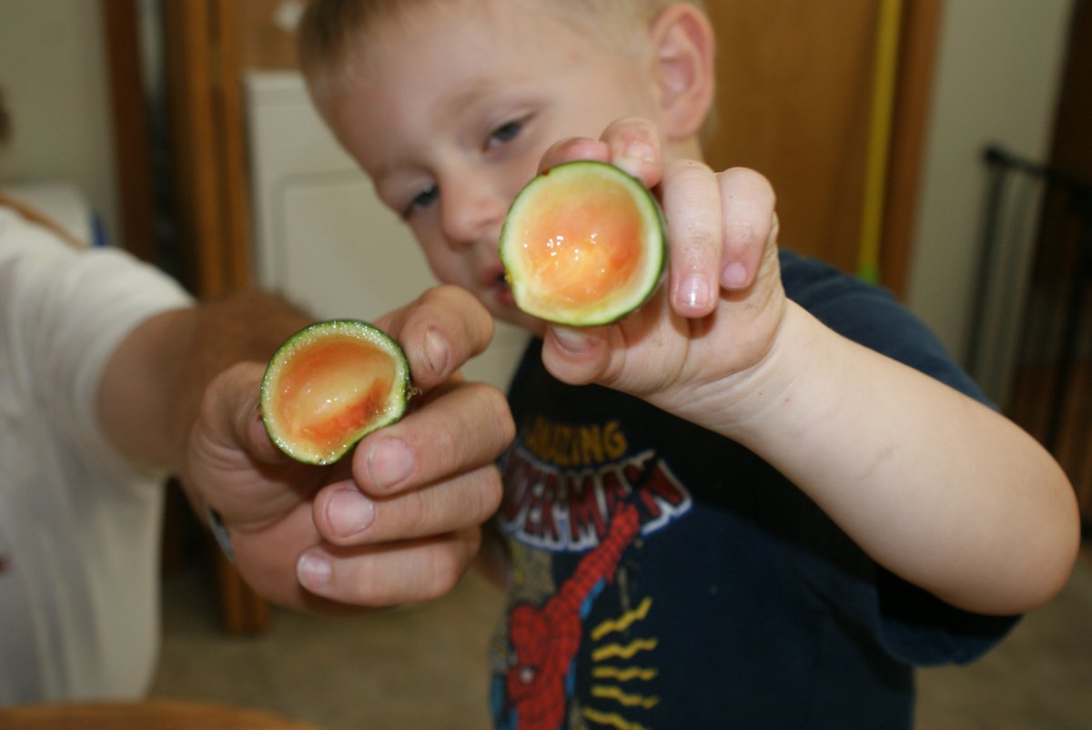 Several years ago DH tried to grow Sugar Baby water melons... He got one (or 2) VERY small melons. Here are pics of him & #1 grandson enjoying A BITE of melon! ;)