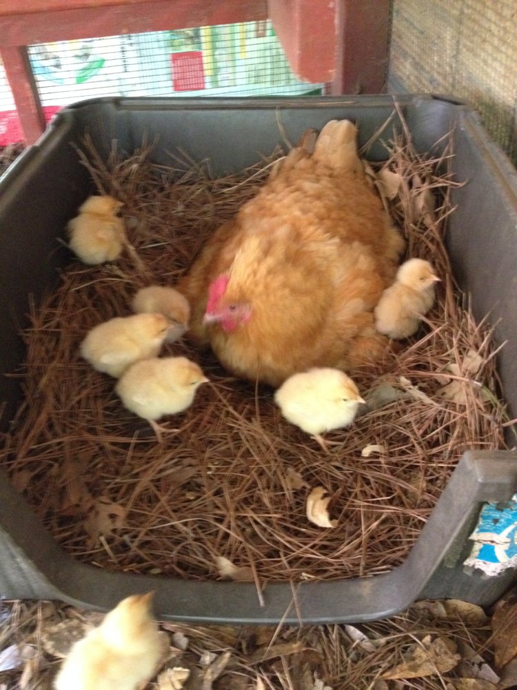 I had her in a pet taxi with her "eggs", but decide it was really too small once chicks are added. I thought about making a run to town to get one a bit bigger, then thought about using the bottom of our small dog house.