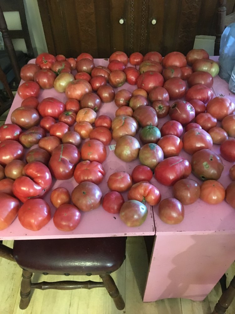 I snapped green beans today, canned 6 pints. I quartered, cored, peeled and deseeded a gallon bag of tomatoes, put it in the freezer. For the past 4 days, I’ve picked a wash pan of tomatoes each day. I have a lot of eggplant to put in the freezer too.