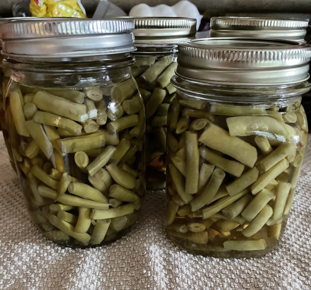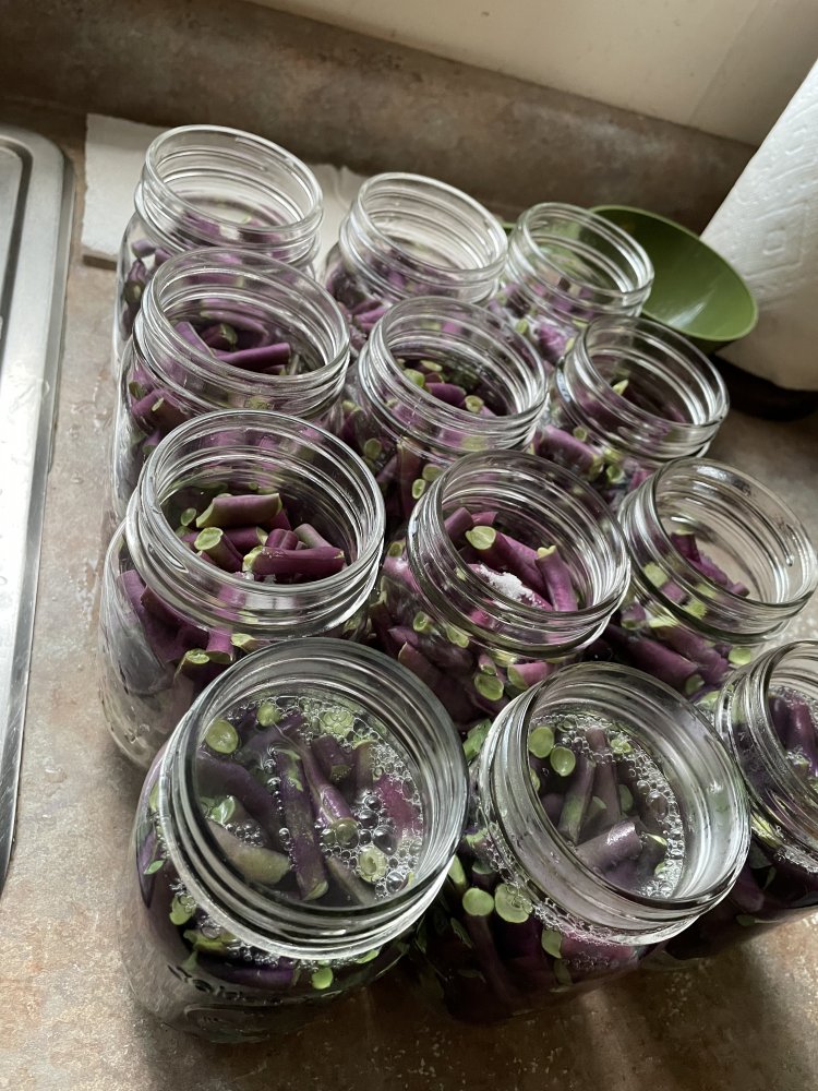 I finally went to the garden yesterday. The squash that was blooming when the kids got here, got busy. I brought in 2 arm loads of zucchini plus a couple of yellow squash. This morning I picked Grandma Robert’s purple beans again. I got half a wash tub full! My husband snapped them for me and I canned 12 pints.