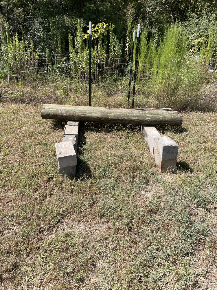 This morning my chore is unloading the treated 8’ long by 7” top fence posts. First make a place to put them. I carried concrete blocks from the stack about 30 feet to where I want to put the posts. I drove in 2 T-posts as a stop.