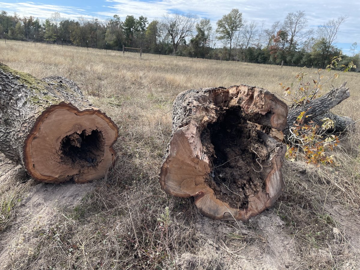 Remember that big oak with the rotten streak, right on the fence line? It was in worse shape than I thought, it was hollow and so rotten that it broke off before he finished sawing it down.