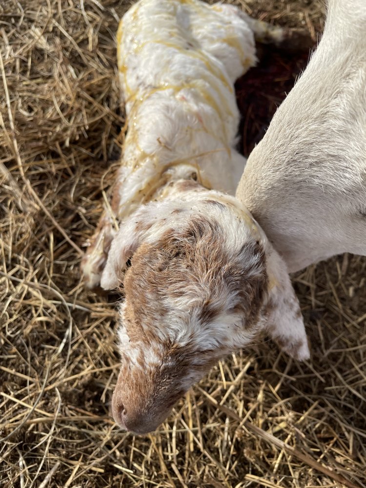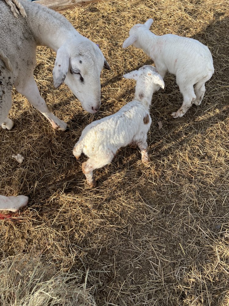 I kept an eye on Cleo, she was in labor and straining. Toes were showing so I gently pulled when she pushed. A white ewe lamb was born! A little bit later Cleo had another ewe lamb and did not need assistance.