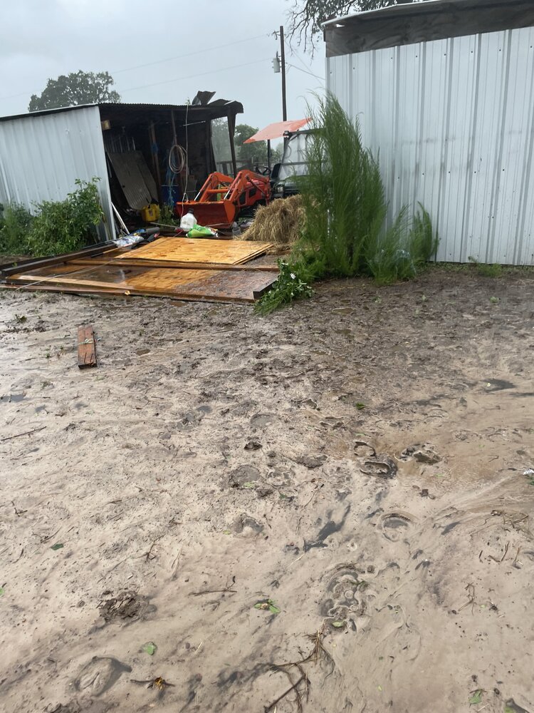 Winds blew out a section of the storage sheds. The back of the shed serves as a wall for the horse pen. I put her in the round pen. HUGE nails sticking up.