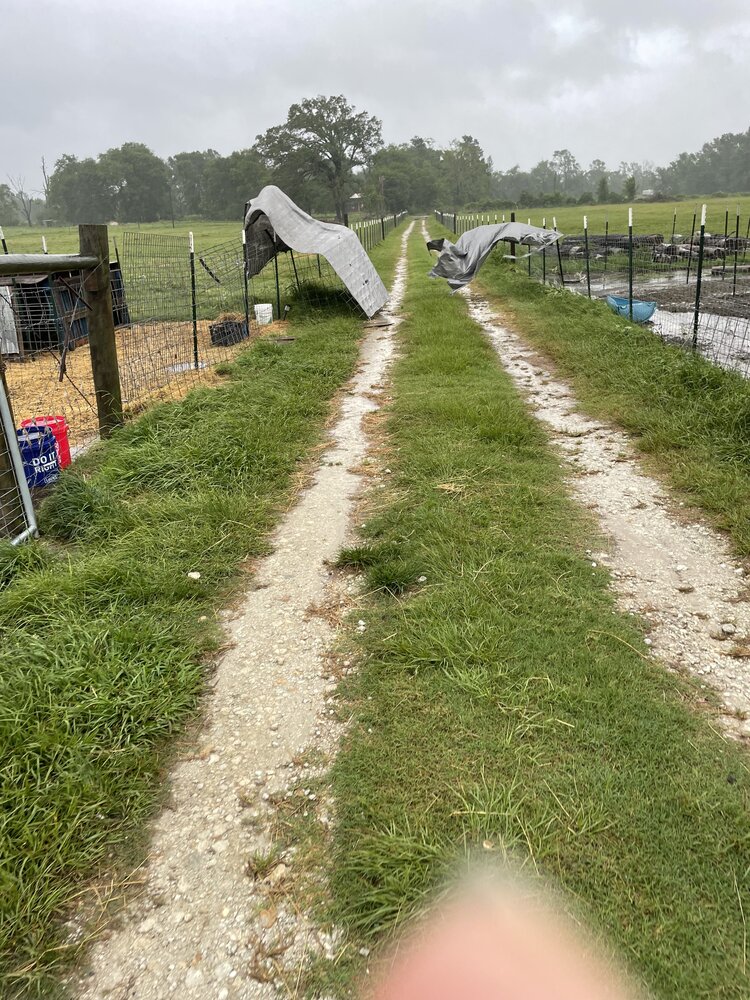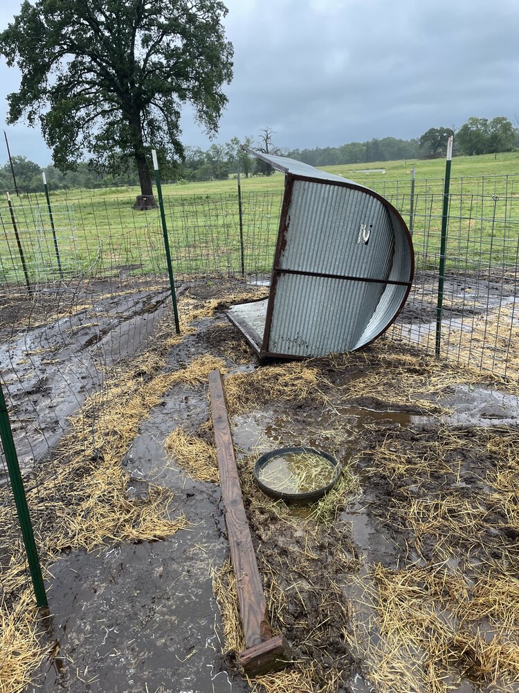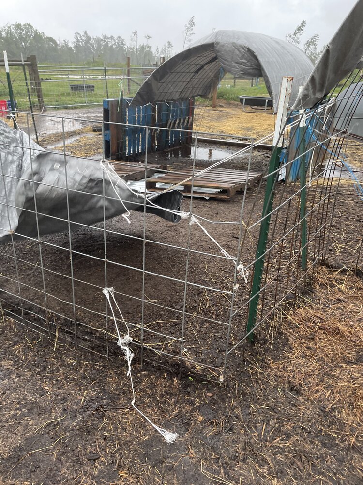 The cow panel hoop shelter I built in the front field had lift off! It flew across the driveway, impaled itself on a T-post and was flapping around. I went out in the wind and rain to cut the tarps off so it wouldn’t fly out on the field.