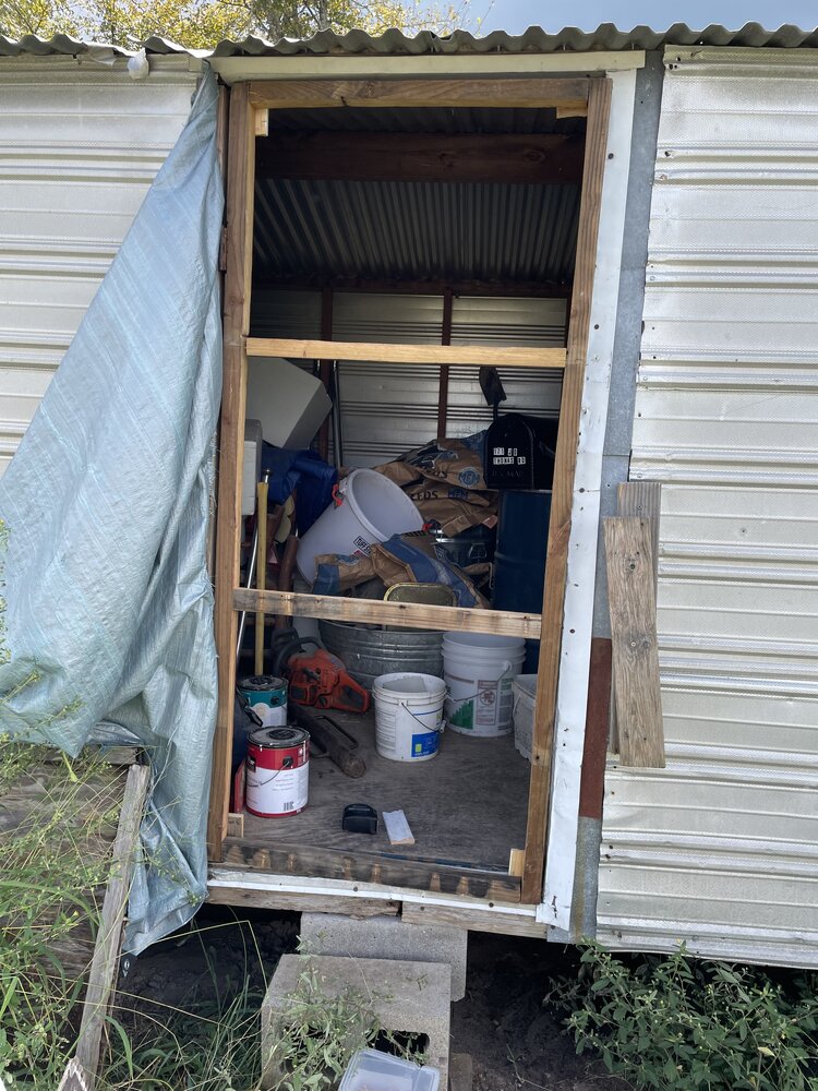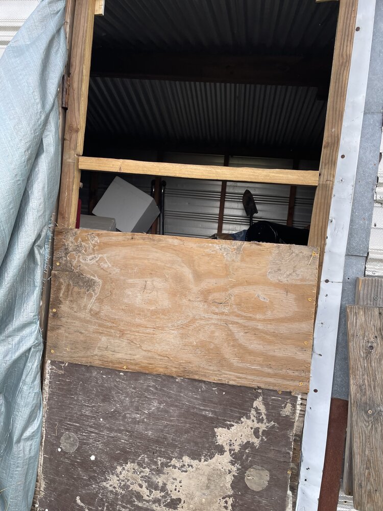 I put on my list, BUILD DOOR FOR PORTABLE BUILDING. In January, in a cold rain, almost dark, I was tired and just finished chores and the door fell off. I found a tarp to hang over the open doorway and put it up. I’ve been hating that darn tarp several times a day ever since. FINALLY I built a door—out of scraps of course. I got some 2x4’s from the shed that the hurricane blew apart. The floor to that part of the shed was pallets with scraps of plywood that came from my son’s house over 2 years ago. I recently pulled up the plywood and pallets, a little bit towards taking the rest of the shed apart.