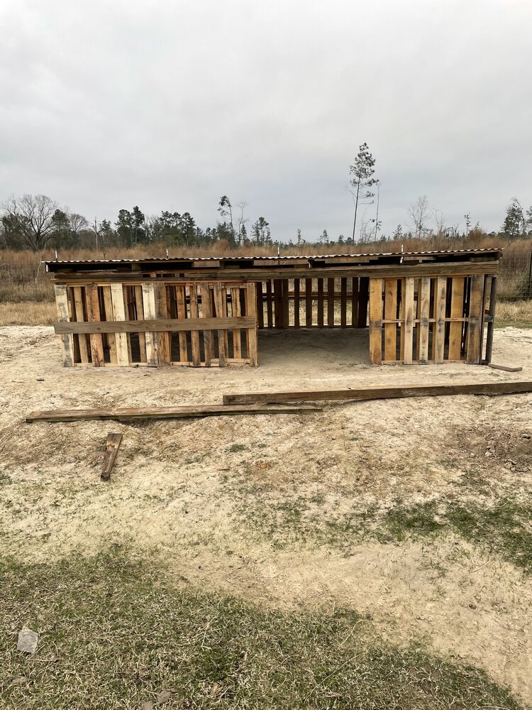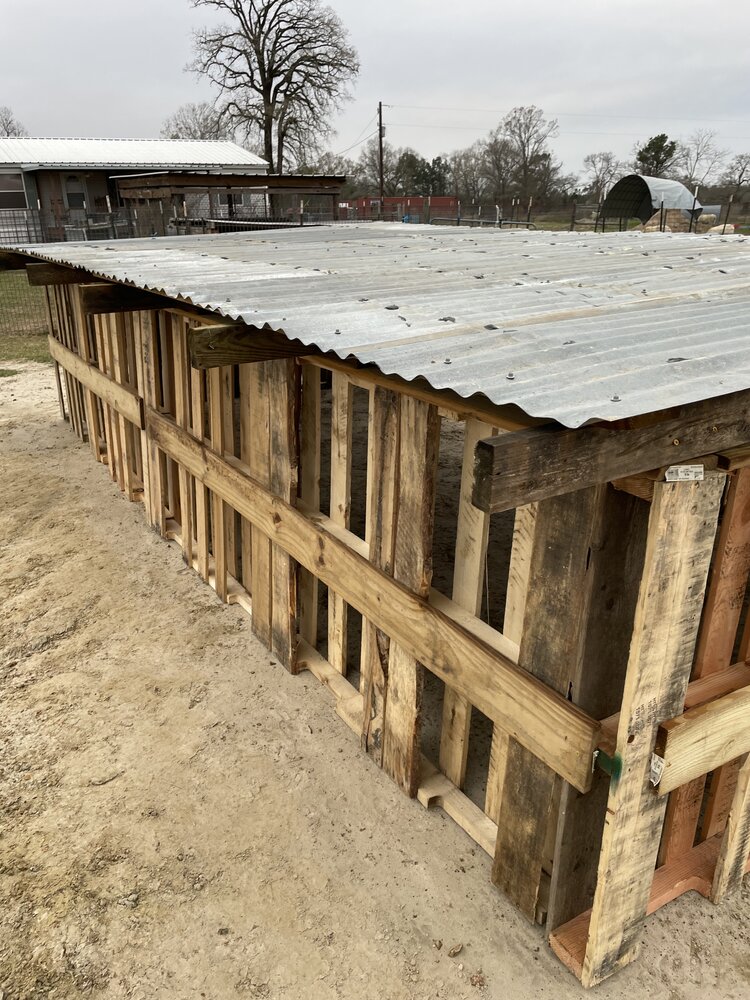 Size is 8’x16’ on the inside. Tin is 10’ long with a little overhang. Small, but it will help. Today is church and rain. I’m going to cut open 50# plastic dog food bags and staple to the pallets to block wind. I’ll do that Monday, it will be low of 26F with high of 43F and windy, but it will be sunny.