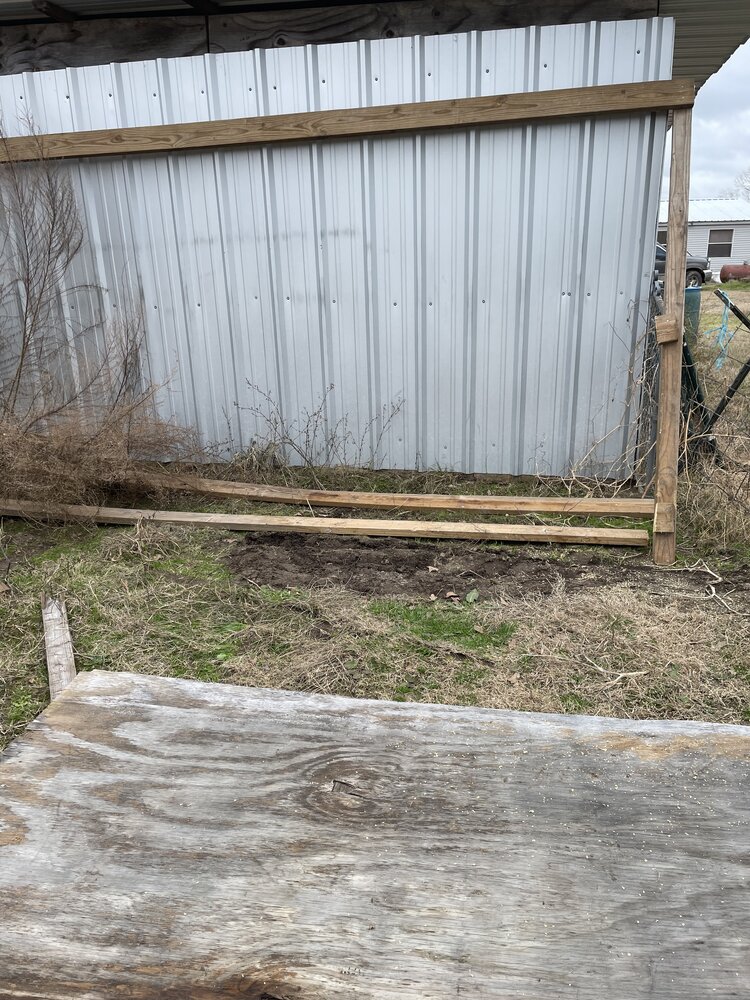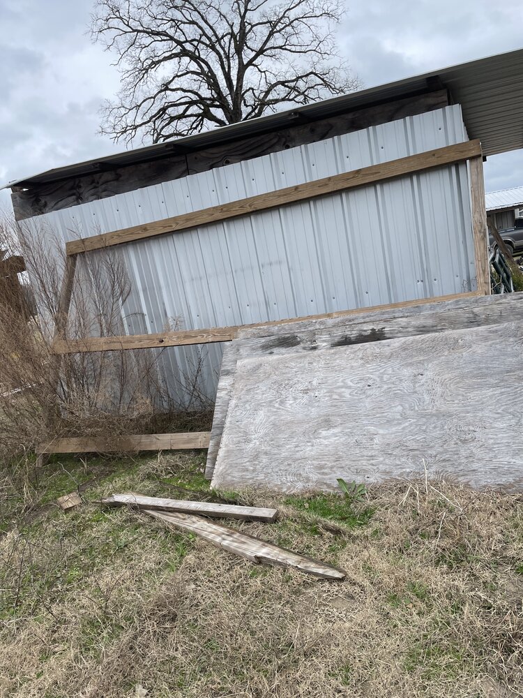 The back wall lumber was leaned on the back wall of the shed part that didn’t blow down. There were 4 sheets of heavy plywood leaned on it.