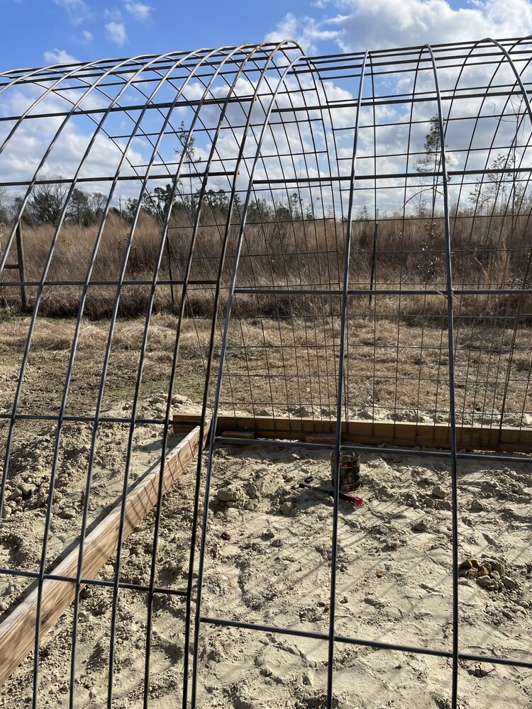 I dragged up 1 cow panel and 2 hog panels. I laid them on the frame, popped up one end and dropped it in place, 3 times. I put bricks under one end of the cow panel and stapled it to the board. Then I did the other side.