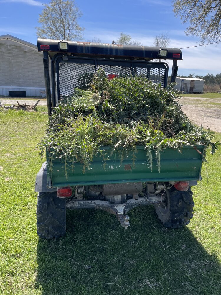 I dug out another mule load yesterday. I spread them out in the sun to dry so I can bag them up and put in the trash. Still plenty out there, but I’m making progress. I’ve got to butcher chickens today, then process tomorrow and Friday, so no digging thistles. I may have to go lop off bloom heads until I can get back to digging them up. Friday evening I’m loading up lambs and 3 ewes to take to auction Saturday, 3 hour drive one way. Wish there was a decent sheep and goat auction around here, but there’s not one, primarily cattle. I’ll be back on Thistles on Monday.