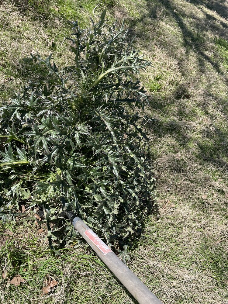 Yesterday I dug up some thistles. I hate those things! I’ve got lots of them. Last year I cut off the blooms and seed heads and threw them away.