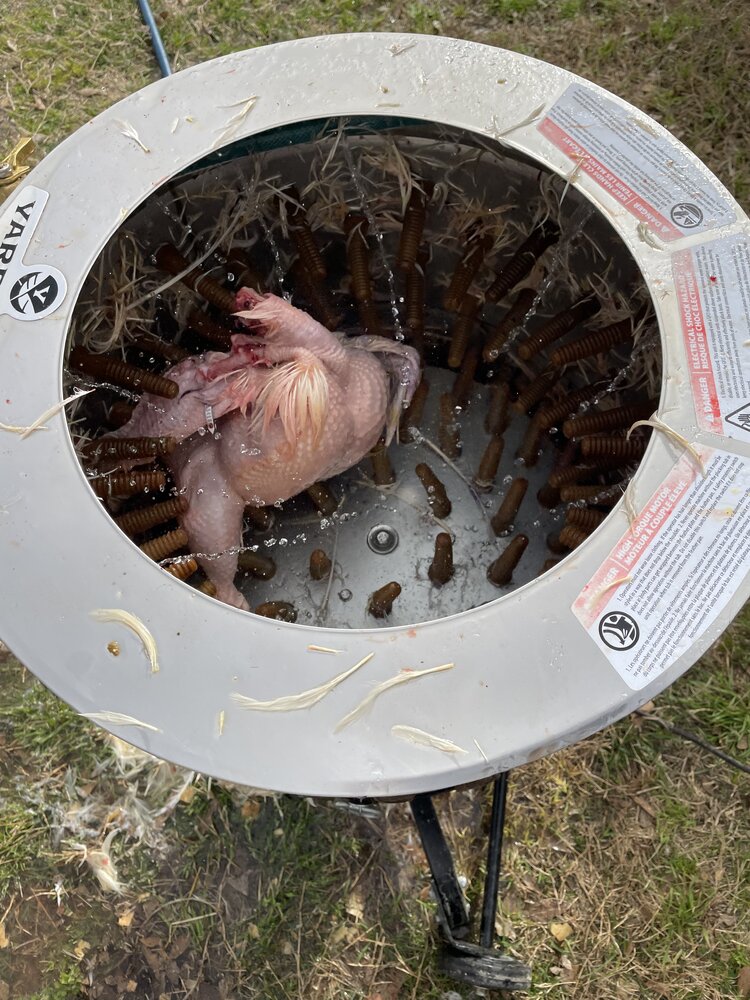 Yesterday I slaughtered 16 chickens. The chicken plucker is so awesome. It sure saved me tons of work. In seconds it did what would take me 20 minutes to do. It hooks up to a water hose, spins around, tumbles the chicken and those rubber fingers take the feathers off. The feathers go down a drainage chute in a pile for fairly easy clean up.