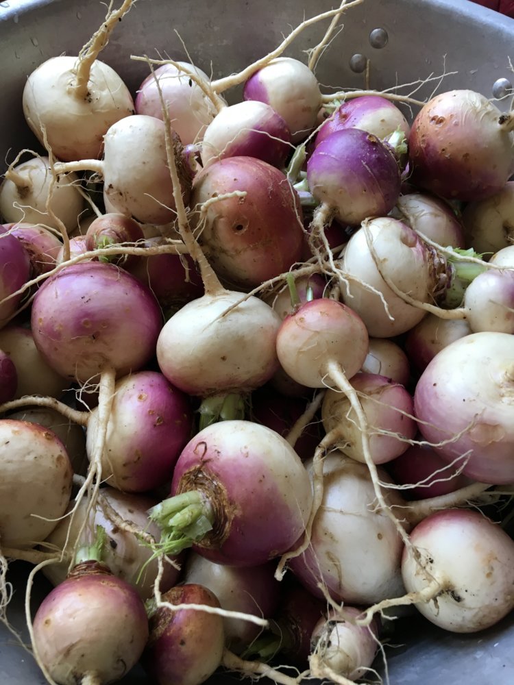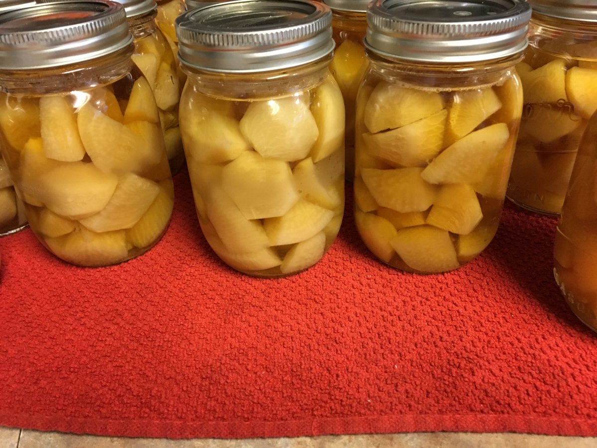 I had a short row of turnips, we like the greens. I got several bags of greens in the freezer and we have had turnips, roasted, a few times. Last night I cubed some up, boiled until done, then drained all the water off. I plopped some butter, salt and pepper on ‘em and they were good. So I decided to pull the turnips and can them. The greens are gone anyway. I got a wash pan of turnips that yielded 15 pints of turnips. Now we’ll have to try them to see if we like them.