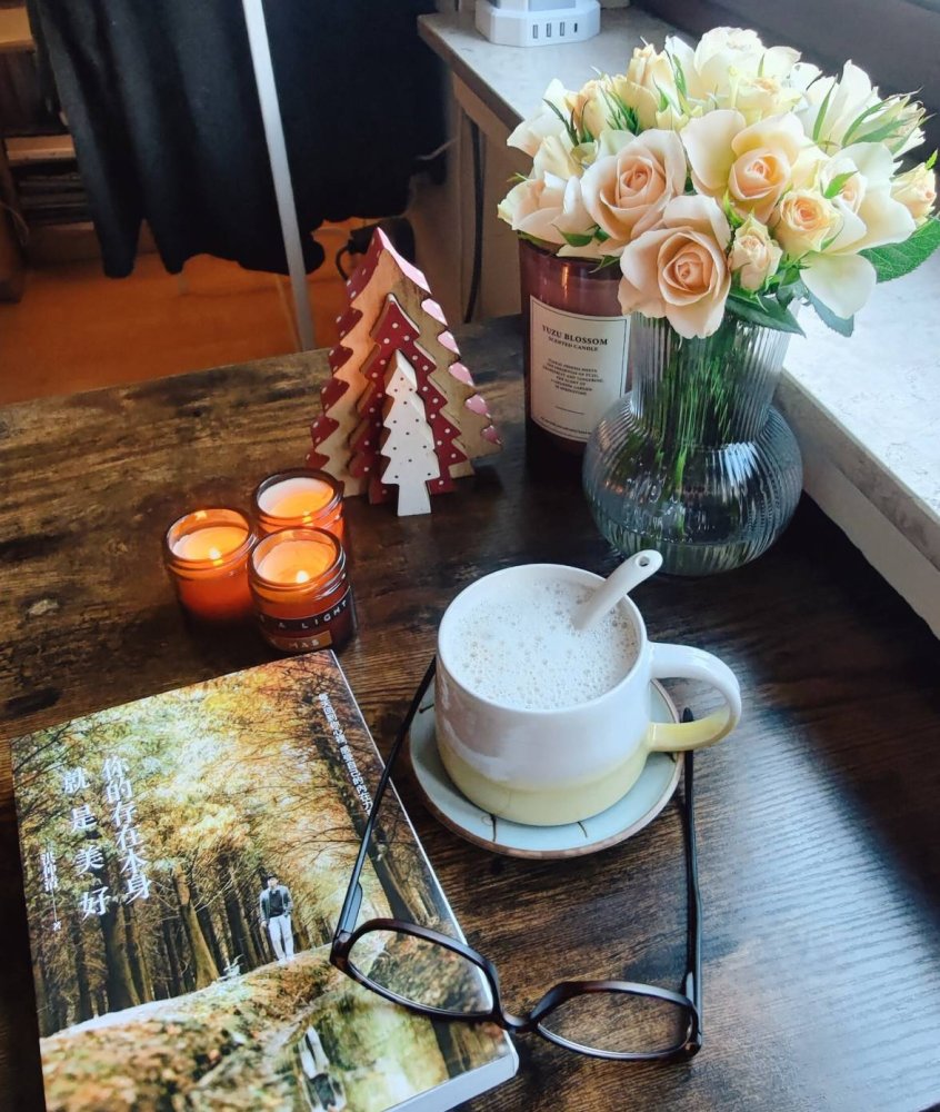 The image with the book, the bouquet, and the burning candles makes for a really lovely winter tableau.Mostly cloudy with showers here, typical winter days