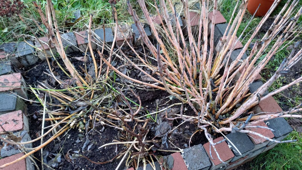 The sedum (autumn joy, I just knew today that they are edible, although I don't think I will eat them.) needs to be divided next spring. I just removed the old stems and cleaned up a bit.