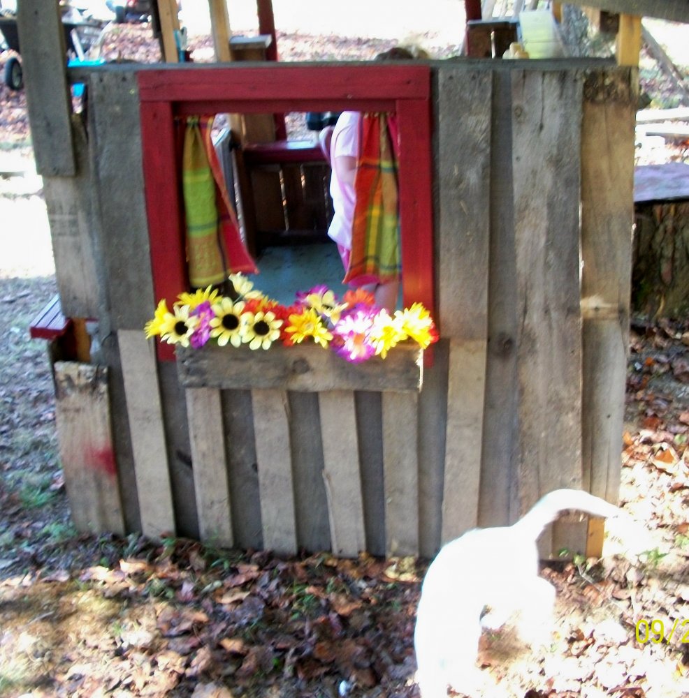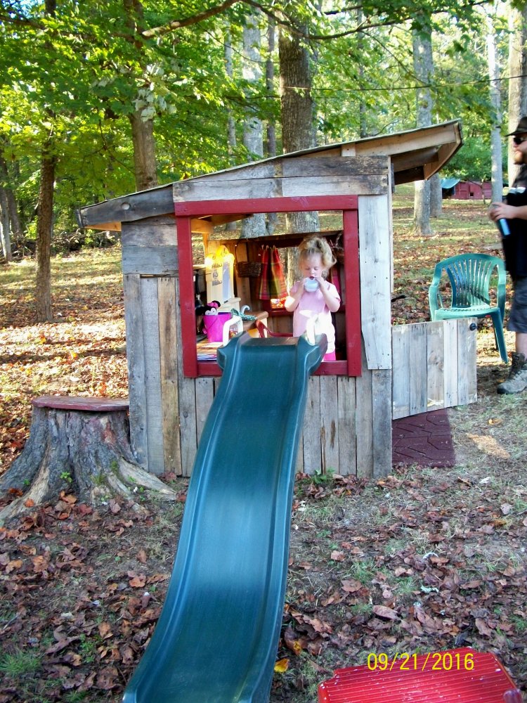 A few pics of the pallet playhouse and curb side slide...she got to play in it for the first time these past few days and she LOVES it! Couldn't get her out of it, she woke up in the night wanting to go play in it, woke up early to get Gran up so she could go out to her "house".