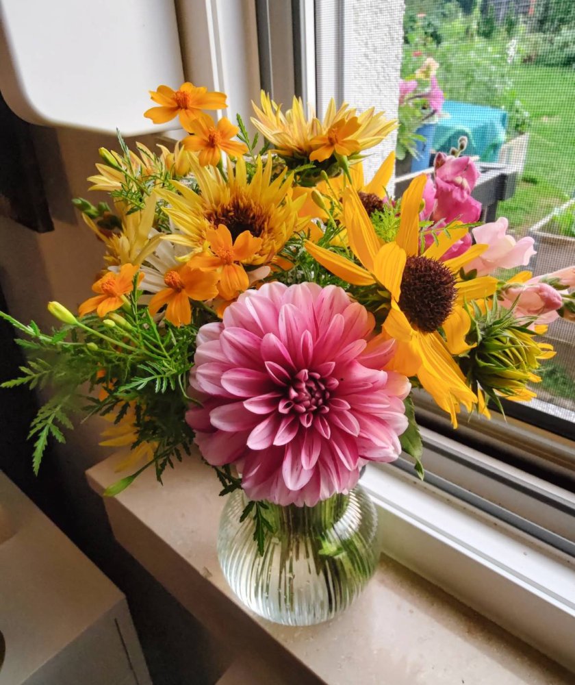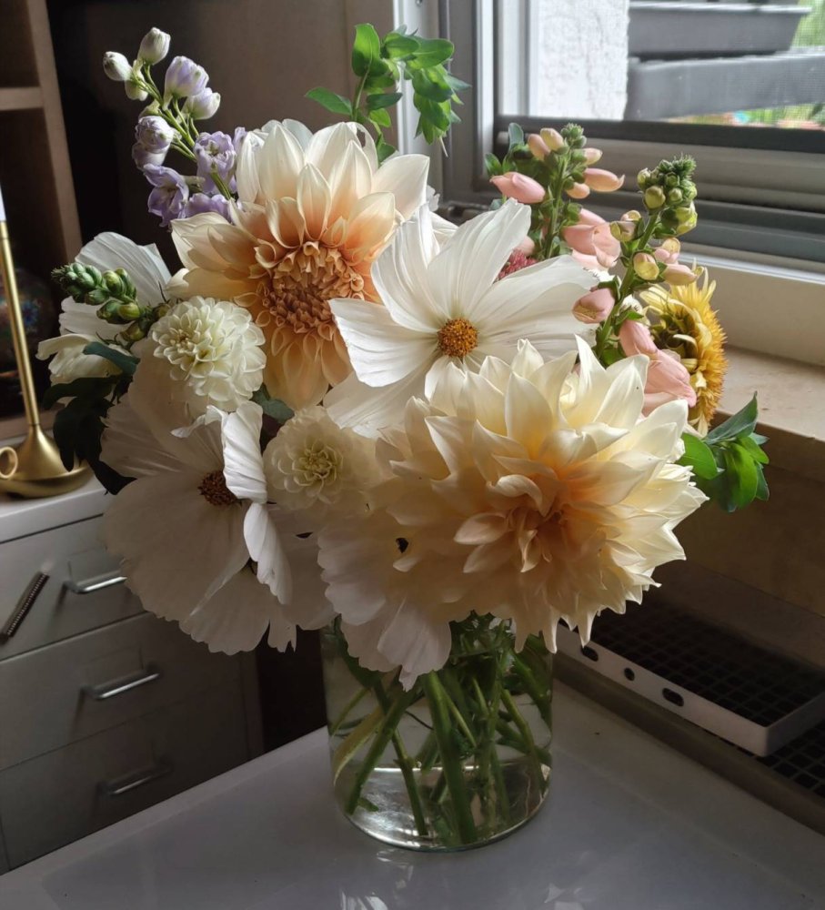 It's a relief to only grow enough cut flowers to bring a few home and stop to give a few away rather than taking them to the farmers' market to the public and competing with the flower shops for sales.
