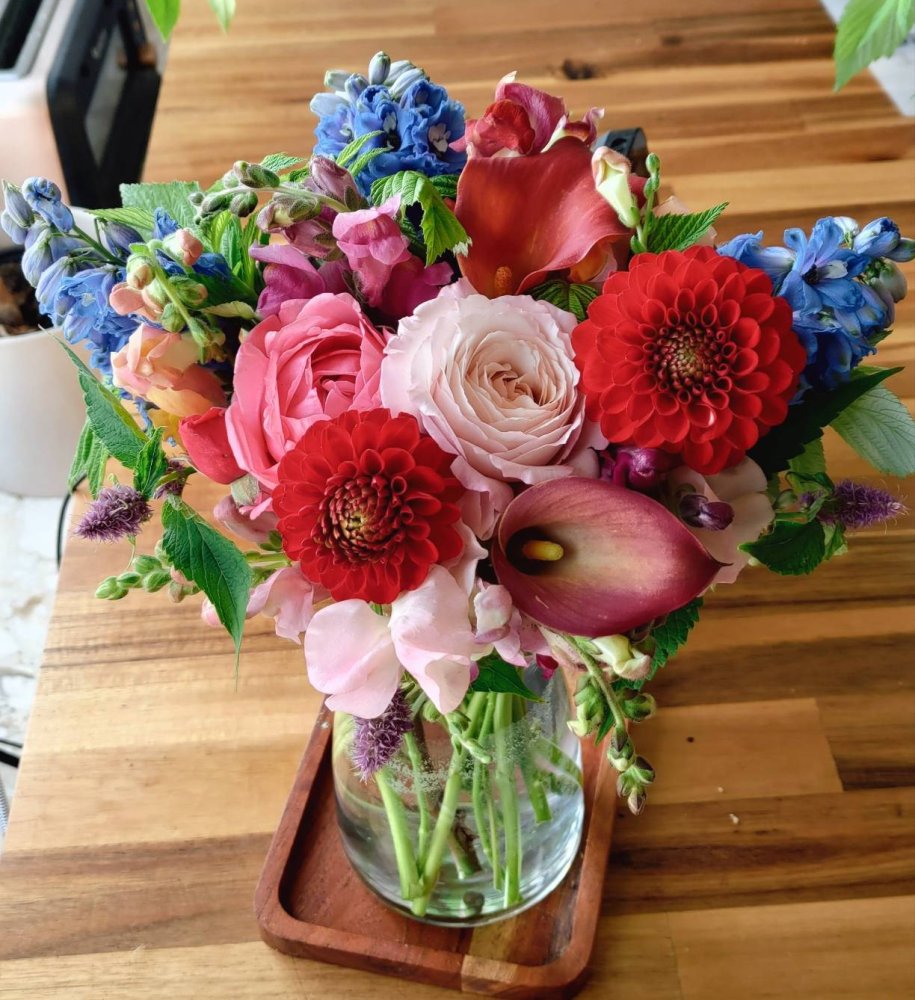 Roses, Dahlias, Delphinium, Calla Lilies, Snapdragons, Raspberry leaves, and Anise Hyssops