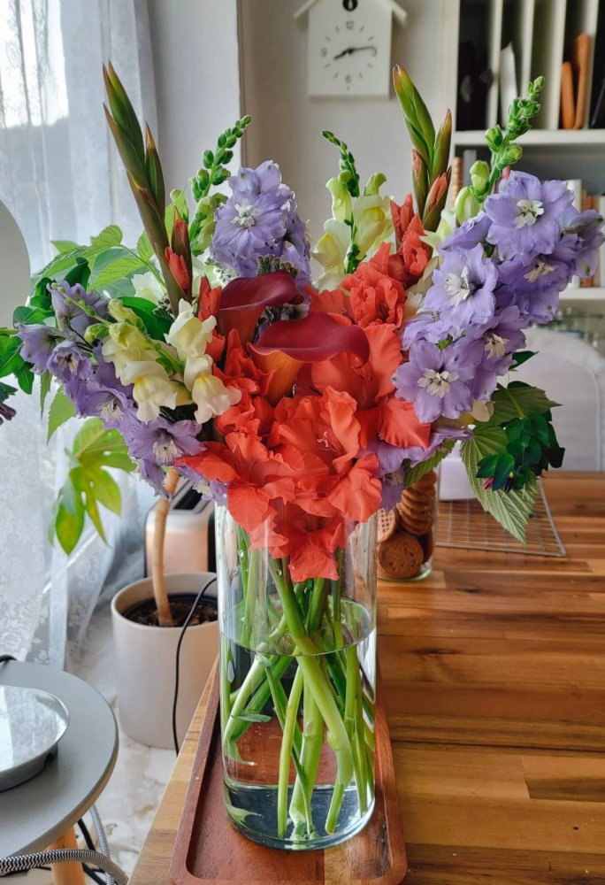 Gladiolus is a more difficult one for flower arrangement due to its unique form. However, practices can improve.
