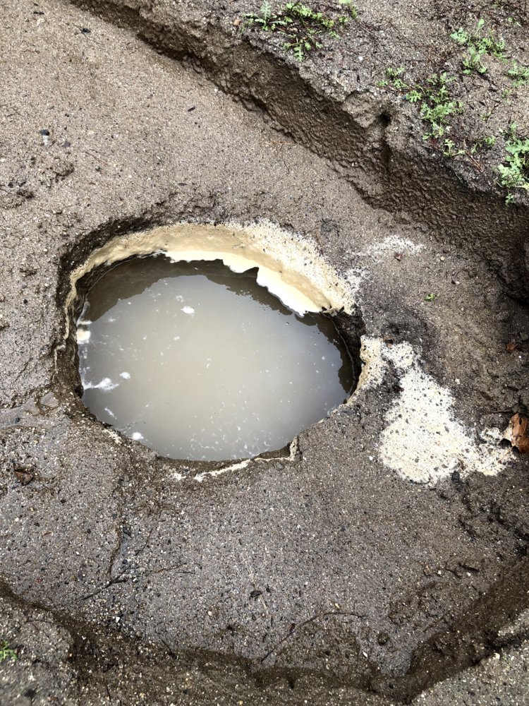 oh and the difference in levels may also just have to do with one hole being more in line with whatever drainage there might be (above or below the surface) - hmm, though i don't see any obvious erosion or signs of water flow there at the edges... ok, in the first pic at the left edge it does appear to be a bit of water flow erosion there...