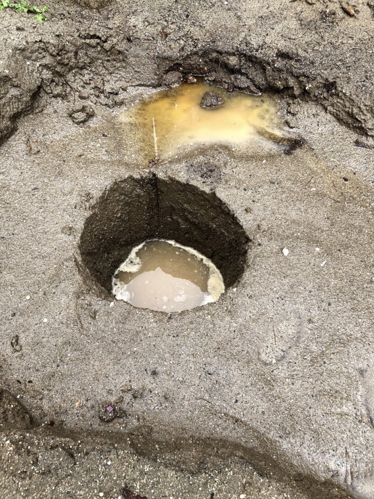 On a side note, we got a LOT of rain last night and I had dug some of my holes out a bit more a few days ago.. This is what I found this AM -- obviously the drainage rates are different between these two holes that are about 5-6 feet apart. If you have any ideas on what the scum is on top of the first pic I'd love to know as it's not the first time I've seen it. Both holes are about the same depth -- the 2nd pic is perhaps about 6" shallower -- but the first image is dug to a depth of 36".. The water level is perhaps about 4-5" from the top of the hole. I had started to dig out the outline of the planter which is why you see various levels.