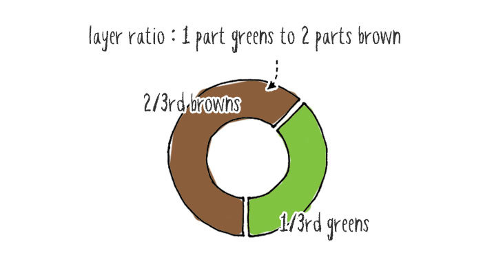 "You want to make your pile about 1/3 greens to 2/3 browns. So, you’ll throw in 1 bucketful of greens for every 2 bucketfuls of browns. "