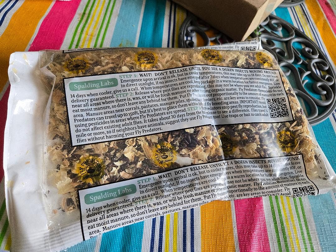 DH stopped at the Post Office last week and I had 3 packages of fly predators (along with Eva condolence cards, since I contacted everybody involved.) DD's were going away for the weekend, but Eldest DD put out one in the North pasture. Yesterday both DD's put out the rest everywhere else. They look like ants, but they are happy to fly away from you when you open the package. Eldest DD suggested blowing on an lingerers.