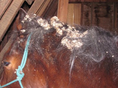 All horses are fed. Mare, who developed a slight limp and has been mostly in her stall for the last week, decided, when I let her graze in the inner sanctum, walked back into the barn COVERED with BURRS!!!